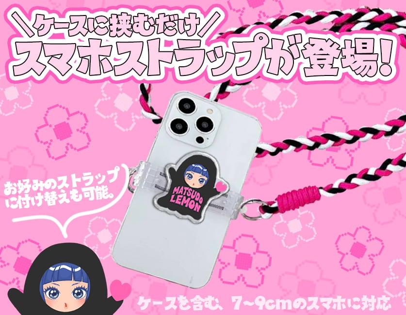 スマホストラップは黒×ピンク×白の編み込みコードですが、お好みのストラップもお使い頂けます。また、クリップ部分にアクリルパーツを貼り付けて頂くタイプとなるので、ご自身でお好みにペタっと貼ってくださいね。